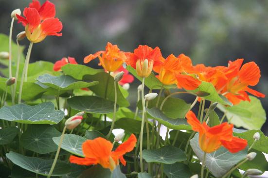 Nasturtiums are bright and happy little flowers and a delight to grow, adding rainbows of cheerful color in containers, beds and borders for the entire growing season. Nasturtiums are easy to grow from seed and thrives in average to poor soil. Many gardeners include them in the salad garden for culinary purposes as the leaves and flowers are entirely edible!